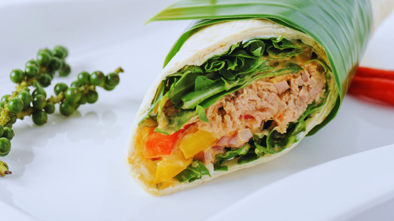 Un'ottima combinazione di proteine e carboidrati: un wrap (piadina) di tonno con verdure come cetrioli o pomodori aggiunge fibre e vitamine. Si consiglia di scegliere tortillas integrali per un apporto più equilibrato di fibre e carboidrati complessi.