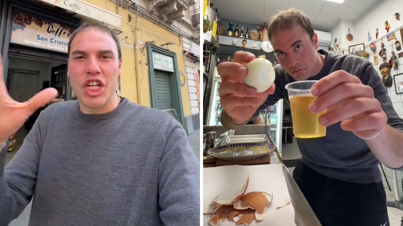 Il racconto comincia tra le stradine del quartiere San Cristoforo, uno dei più popolari e genuini di Catania. Placido non ha trovato l’indirizzo su internet. Nulla su TripAdvisor, zero recensioni su Google, nemmeno un segnaposto su Maps. Solo voci, indicazioni a voce da passanti incuriositi. Un’esperienza che più analogica di così non si può. In realtà nel video non lo specifica: è un utente catanese a scriverlo e Placido a confermarlo. “Ho fatto 300 km per arrivare qui”, dice Placido entrando in quella che sembra “una taverna anni '60 o '70”, con tanto di gabbiette con gli uccellini, tavoli in formica, vetrine che non sono nuovissime, adesivi scritti a mano con il prezzo delle uova e botti d’acciaio. Il luogo è così autentico da sembrare il set di un film italiano degli anni d’oro, ma non è fiction: è realtà viva e vissuta.