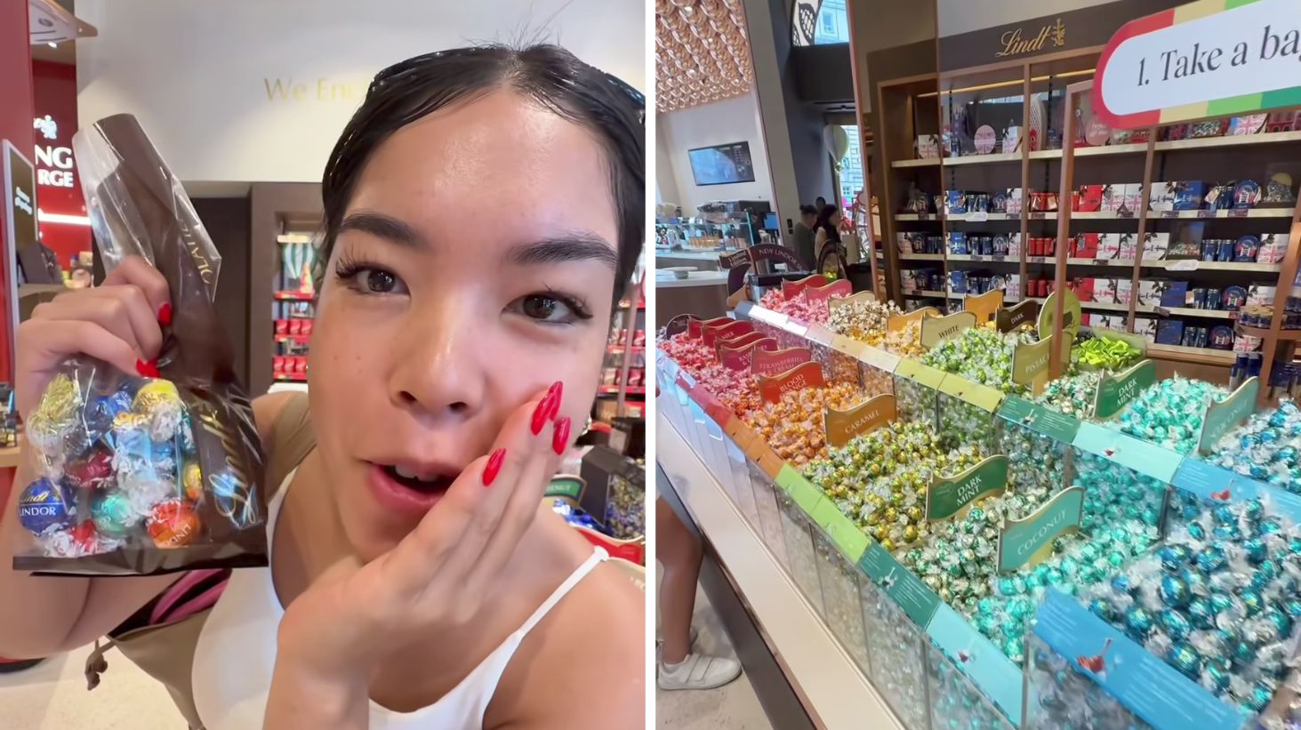 La content creator nel negozio Lindt, con un sacchetto pieno di cioccolatini di tutti gusti diversi.