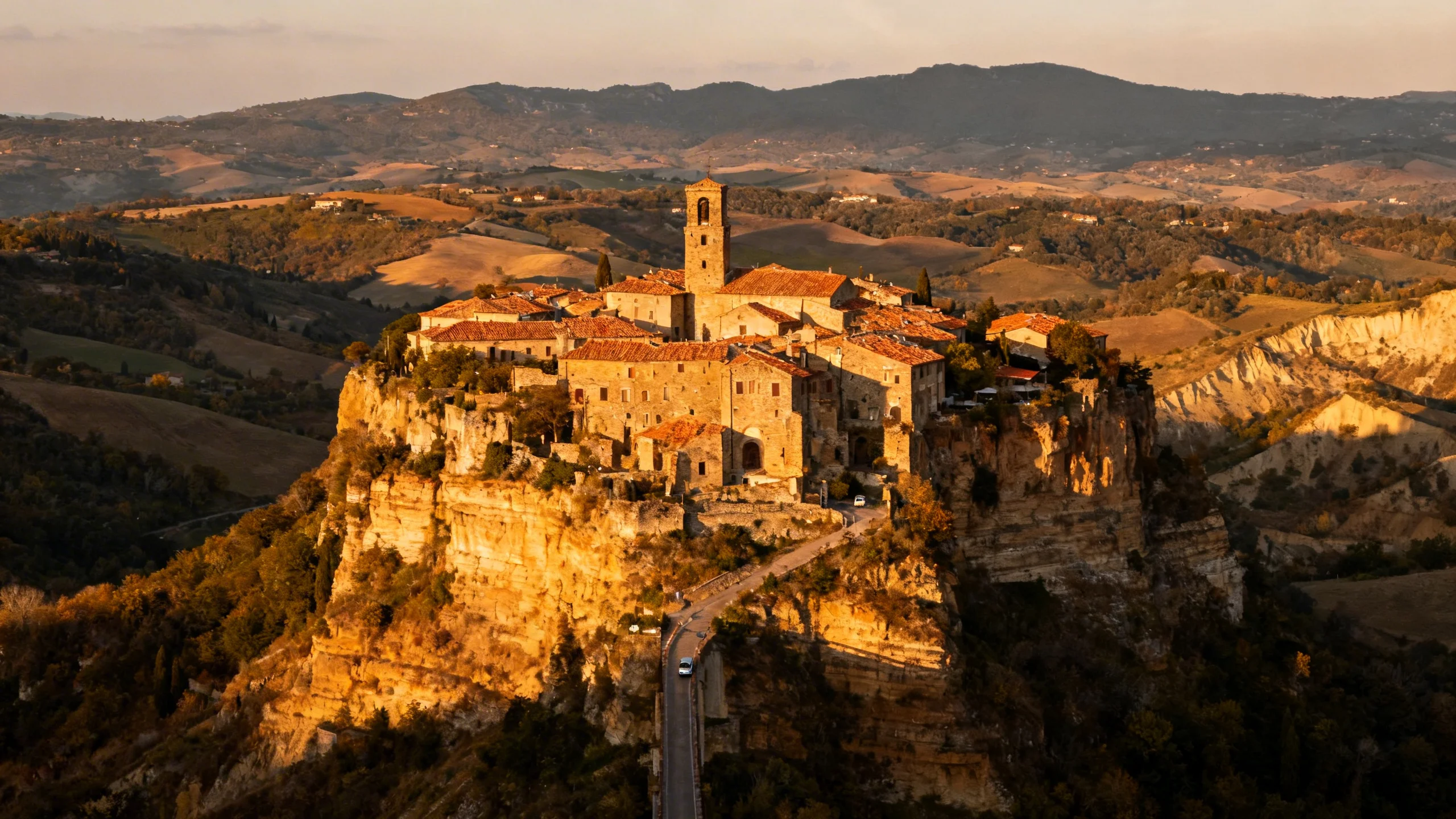 Il borgo è raggiungibile solo attraverso un ponte pedonale di 300 metri sospeso nel vuoto. Sotto, la Valle dei Calanchi si apre come un paesaggio lunare, con gole e pinnacoli di argilla modellati da millenni di pioggia e vento. Non esistono auto, non esistono strade. Solo quel ponte e il silenzio.